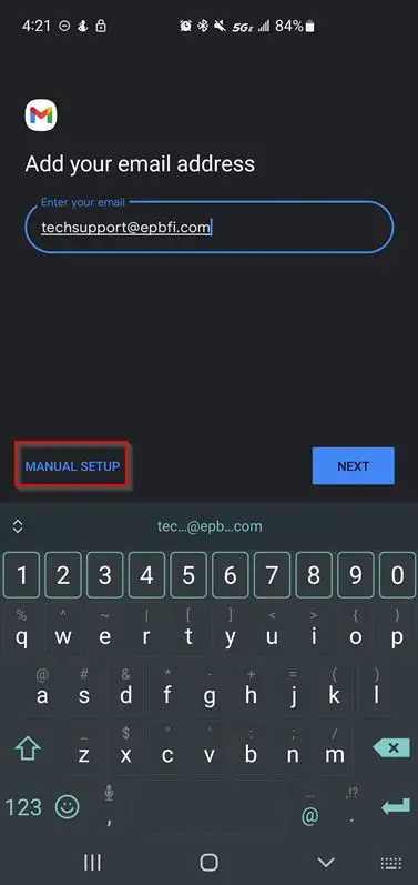 Enter the email address, then choose manual setup.